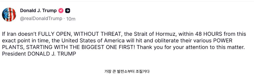 트루스소셜 속보) 트럼프: 48시간 이내에 호르무즈 개방 안하면 이란 발전소 때려뿌신다