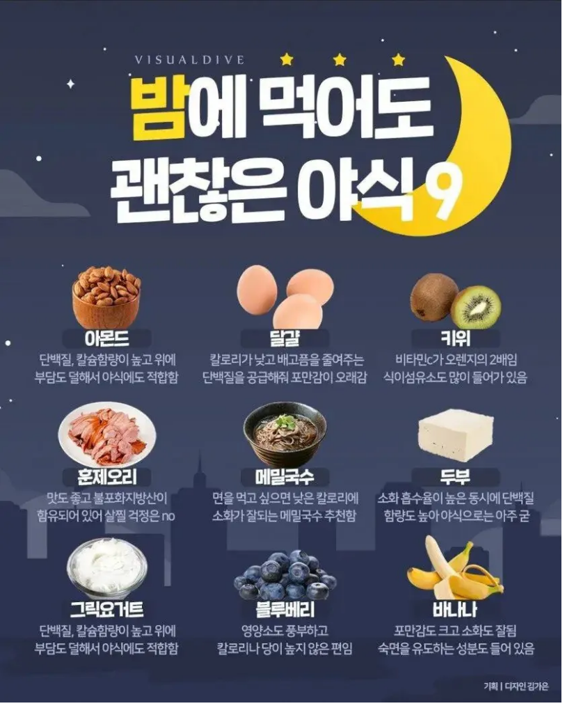 대체로 칼로리 낮거나 소화 잘 되는 음식들이라 밤에 먹어도 비교적 부담 없는 편인 듯.