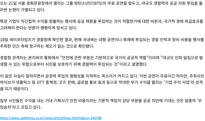 [단독] BTS 광화문 공연 안전 비용, 기업·공공 책임 논란