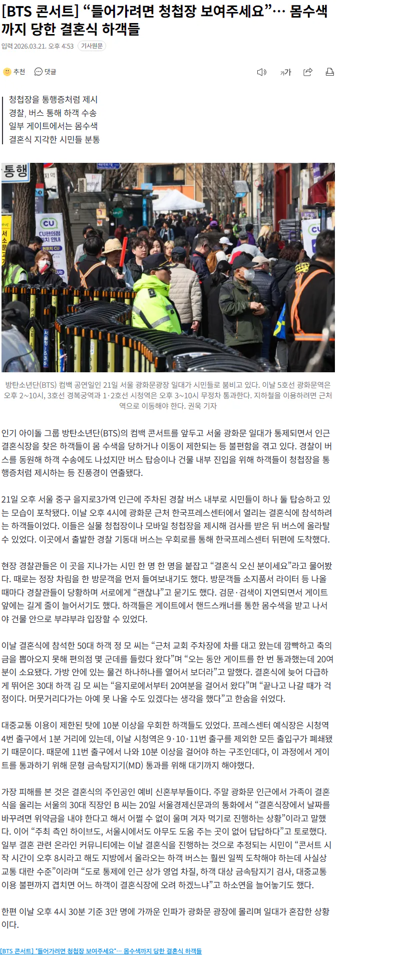 축하해주러 갔다가 몸수색 당하면 기분 진짜 묘할 듯. 보안 빡센 건 알겠는데 하객들